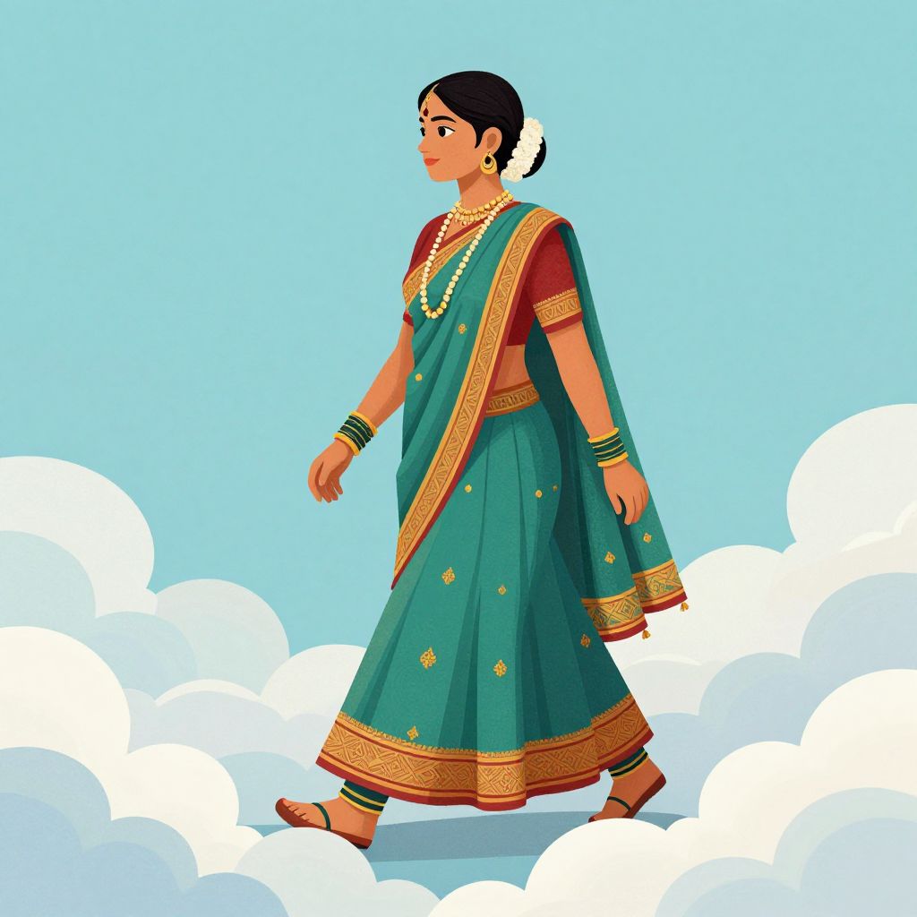 Digital illustration of a South Asian woman in a blue sari with gold trim, red blouse, black bangles, and gold jewelry, walking on clouds