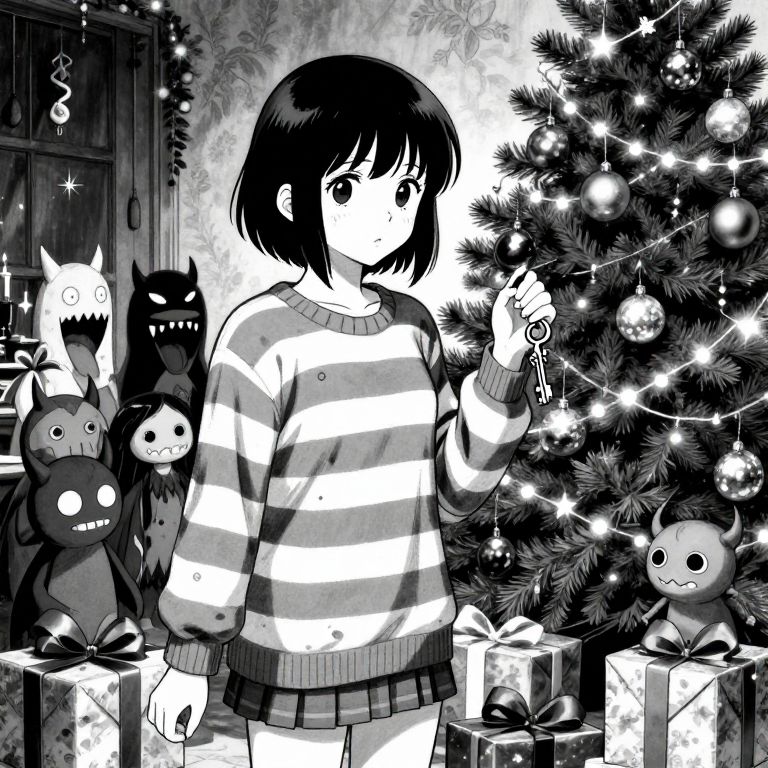 Black and white manga-style drawing of a young girl with short black hair, wearing a striped sweater and pleated skirt, standing in front of a decorated Christmas tree. She holds a string of lights, gazing at them with a calm expression. Behind her, three whimsical, shadowy creature figures with large, expressive eyes and grinning mouths stand near wrapped presents. The tree is adorned with ornaments and lights, and the background features a patterned wallpaper and a wooden door. The scene exudes a festive, yet slightly eerie atmosphere.