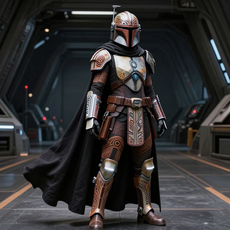 Female Mandalorian armor designs, customized armor with tribal patterns and high-tech features, armored cape flowing, glowing LED elements, starship hangar backdrop, dramatic perspective