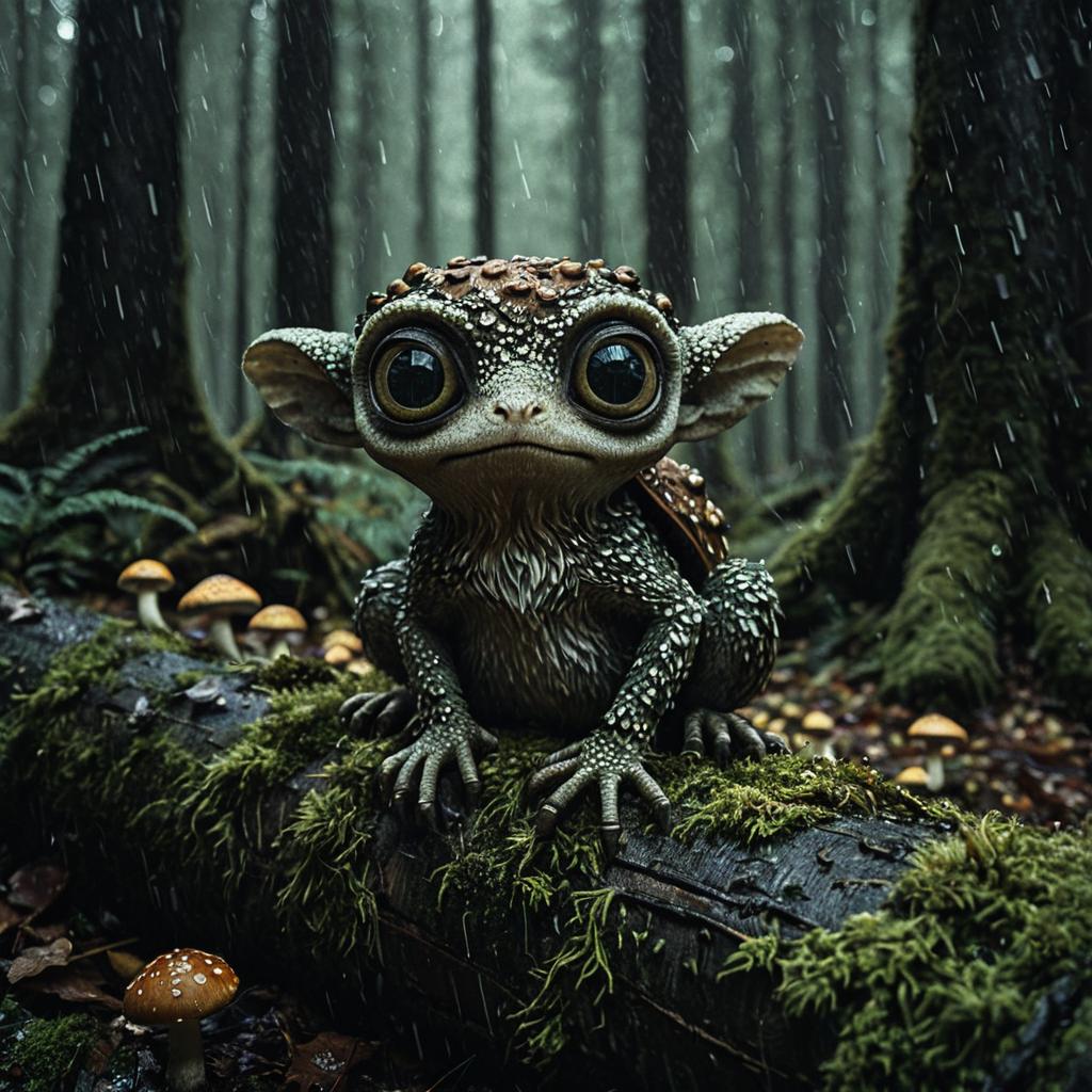 A small fantasy creature with large expressive eyes sitting on a moss-covered log in a dark, dense forest during a light rain, surrounded by fallen leaves and mushrooms, moody and mystical atmosphere, muted green and brown color scheme