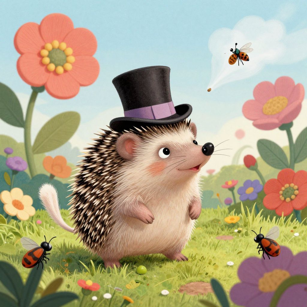 A delightful portrait of a playful hedgehog adorned with an elegant top hat and tails, this whimsical illustration embodies the spirited charm reminiscent of Quentin Blake's enchanting children's book artwork. The hedgehog is surrounded by an abundant garden filled with oversized blossoms and intriguing insects, as seen through the captivating lens of a minuscule seed drifting on a soft zephyr. This vibrant scene masterfully blends adventure and coziness, beckoning viewers to enter this magical realm and partake in the delightful escapades.