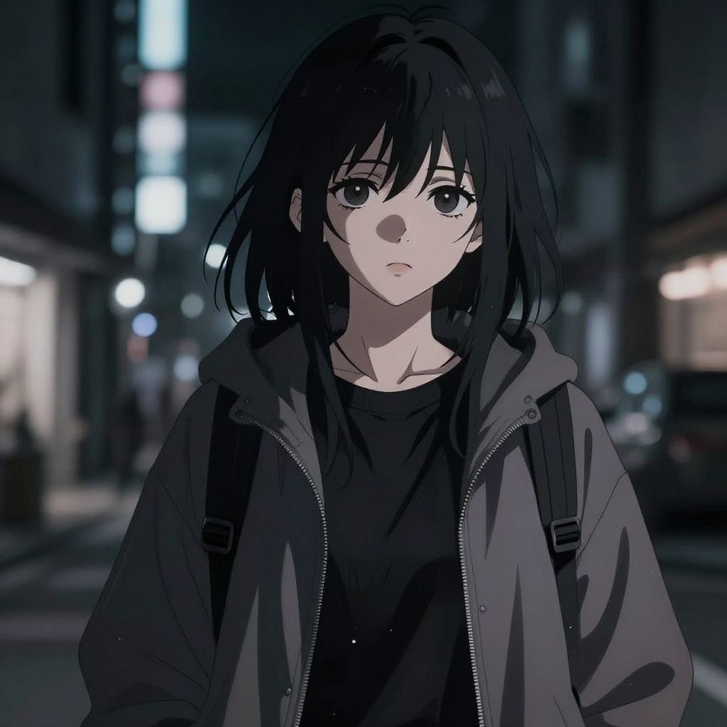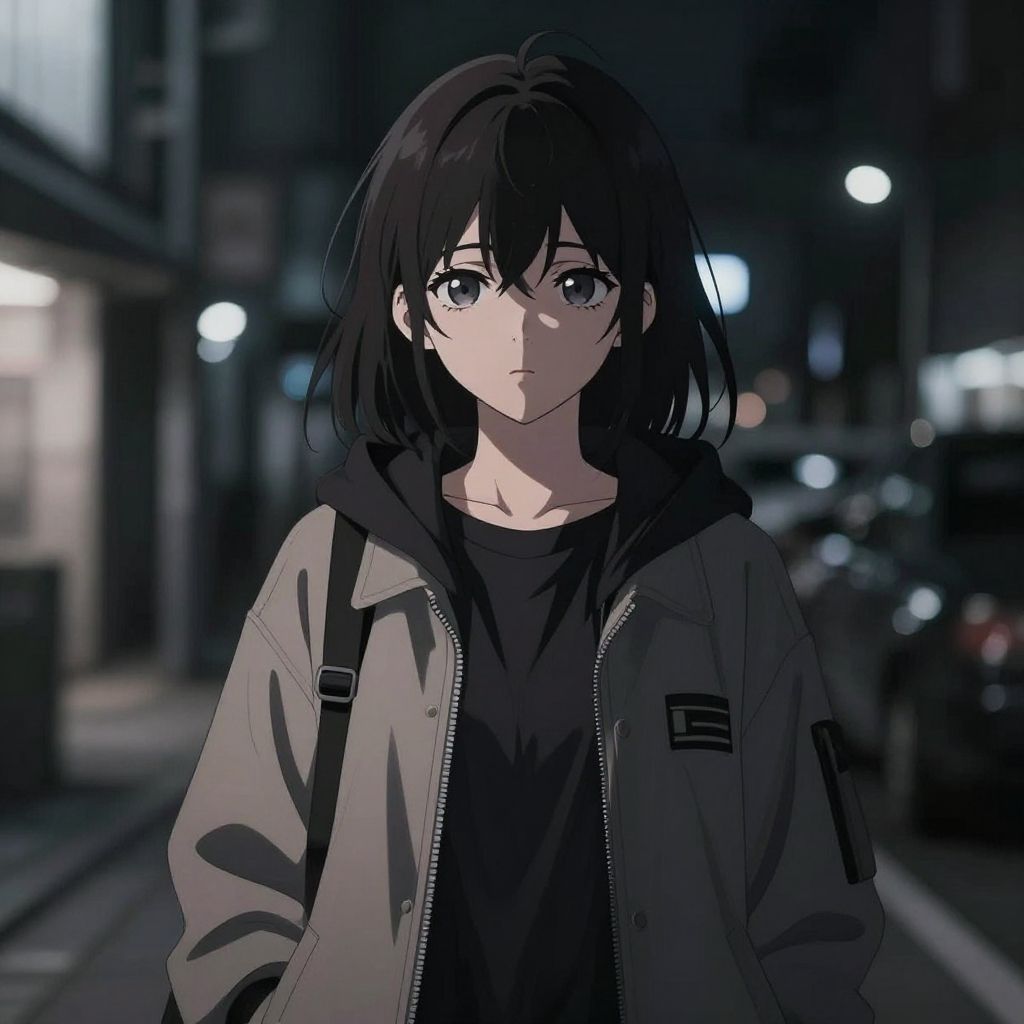 This digital anime-style illustration features a young woman with medium-length, dark black hair and large, expressive brown eyes. She wears a gray, zip-up jacket over a black hoodie and a black shirt. Her expression is neutral, with slightly parted lips. The background is a dark, urban street at night, with blurred streetlights and indistinct buildings creating a moody atmosphere. The image uses soft lighting and shadowing to highlight her face and upper body, giving a slightly somber, introspective feel. The street and background elements are out of focus, drawing attention to the character.