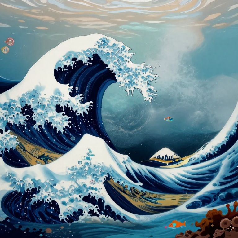 Digital art of a massive, white-capped ocean wave crashing over dark blue water, with a small boat and fish in the background. Sunlight beams