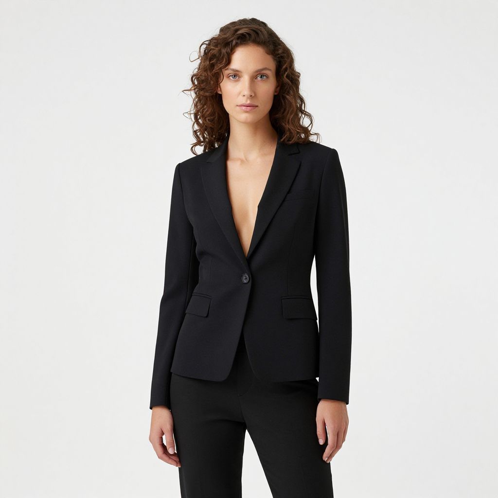 Photograph of a Caucasian woman with curly brown hair standing against a plain white background. She's wearing a black blazer with a deep V-neck, buttoned at the middle, and black pants. Her expression is neutral, and she has fair skin and blue eyes. The blazer fits snugly, highlighting her slim figure, and she stands with her arms relaxed by her sides.