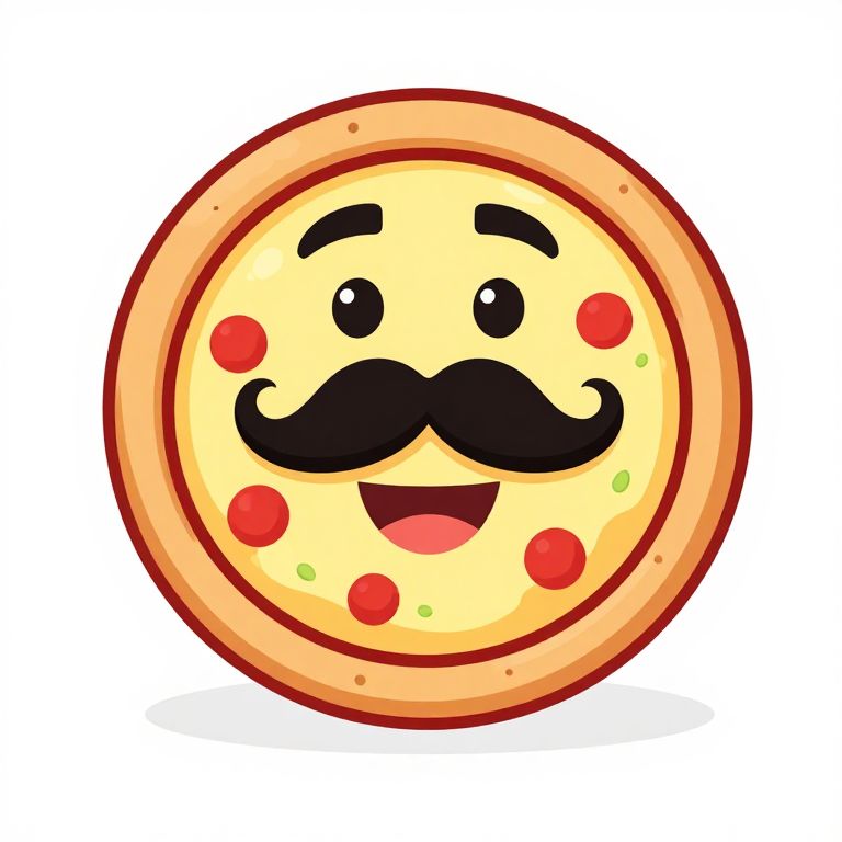 Cartoon pizza with yellow cheese, black mustache, and red blush dots, smiling open-mouthed. Bright, colorful digital illustration.