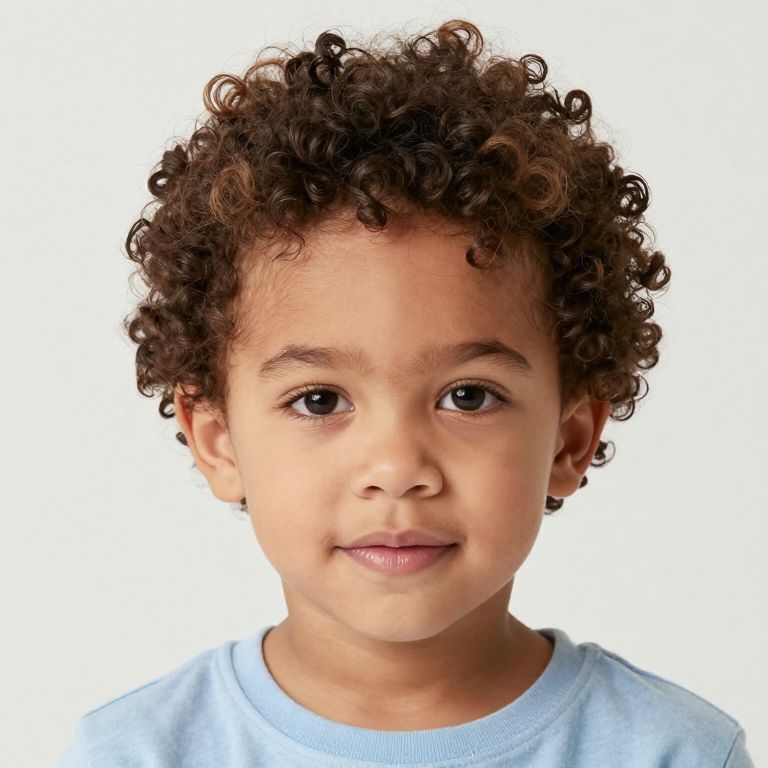 Photograph of a young boy with curly brown hair, brown eyes, light brown skin, wearing a light blue shirt, smiling subtly against a white background