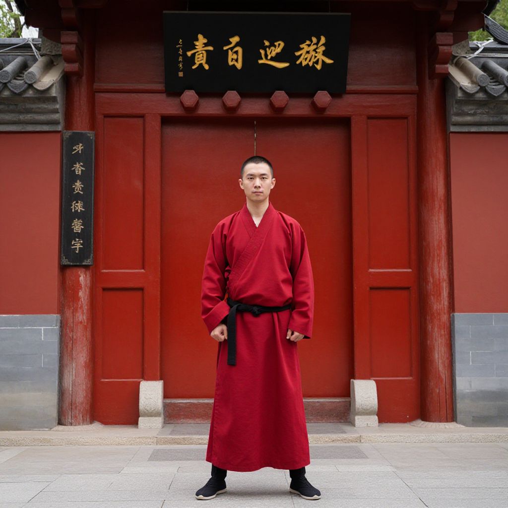 "Shaolin Kung Academy, man in a red robe standing in front of a red door"