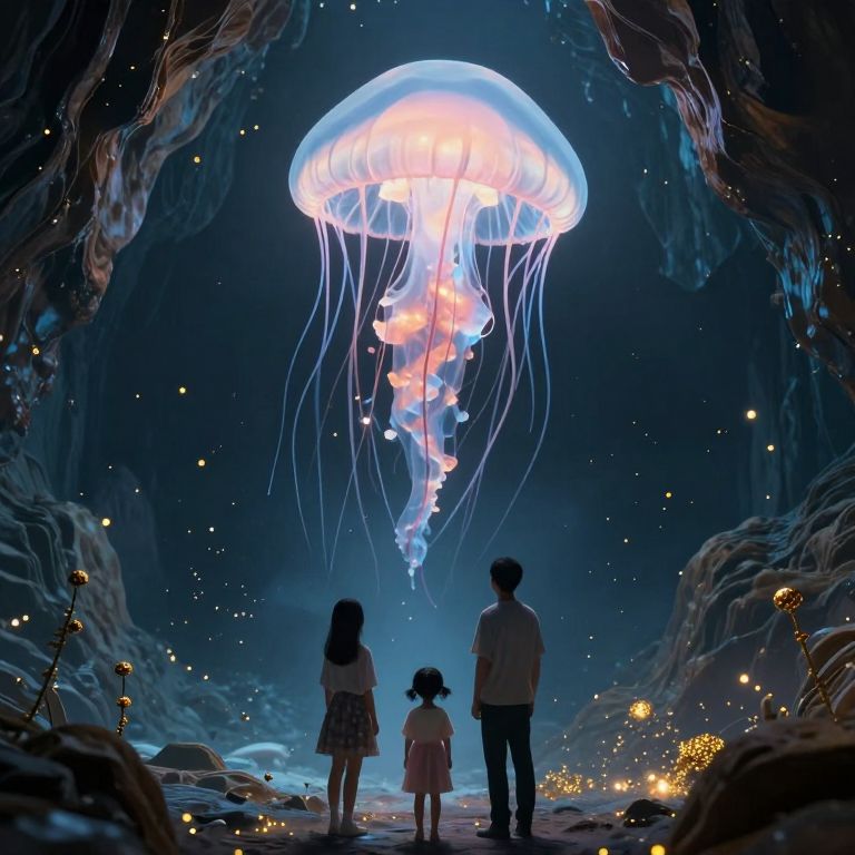 In a mesmerizing cyberpunk-inspired 3D render, a towering jellyfish bathes an underground ocean city in bioluminescent blue light, casting hypnotic shadows on glass-domed libraries where tranquil figures study illuminated scrolls, evoking a surreal blend of fantasy and futuristic aesthetics.