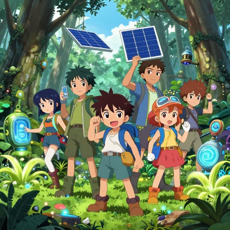 Anime-style illustration of five children in a vibrant forest, holding solar panels and glowing orbs, wearing outdoor gear, and smiling. Bright, colorful, and