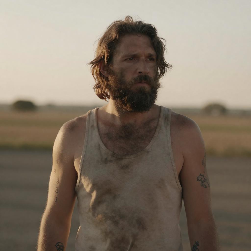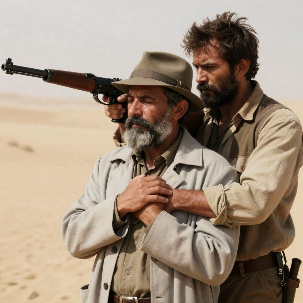 Photograph of two bearded men with disheveled hair, wearing striped shirts, leaning over a concrete wall. The man on the left smiles widely, holding a gun in his right hand. The man on the right raises his right fist, looking determined. Background includes a blurred wall and window. Both men have rugged, weathered faces.
