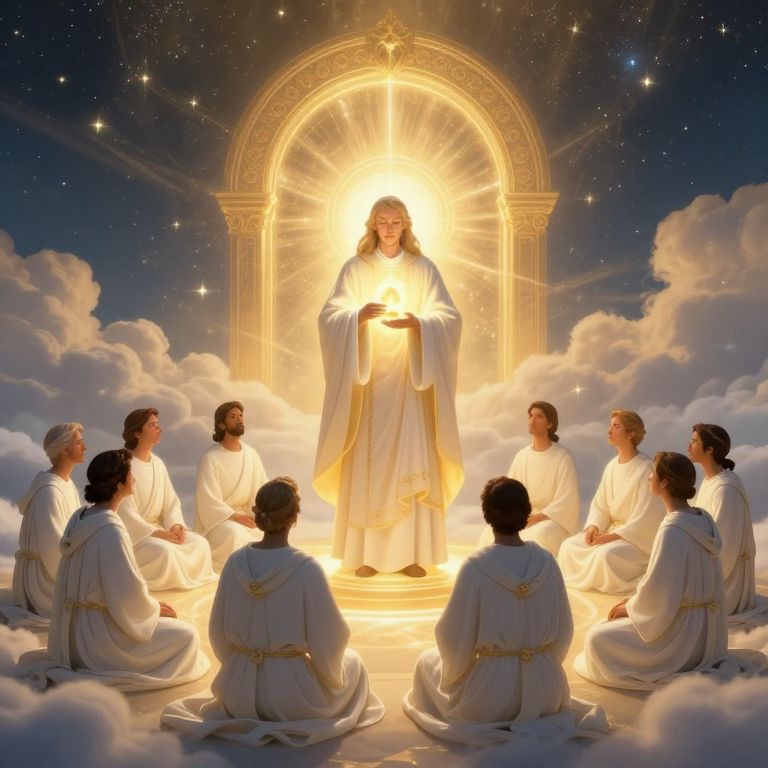 Priestly figure stands illuminated by radiant light within a celestial arch, offering a glowing orb to a circle of seated worshippers draped in white robes, all bathed in ethereal golden hues against a backdrop of starlit skies and floating clouds.