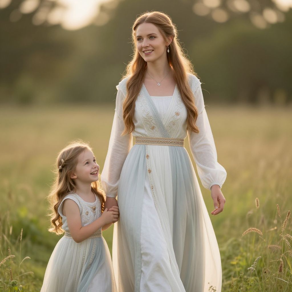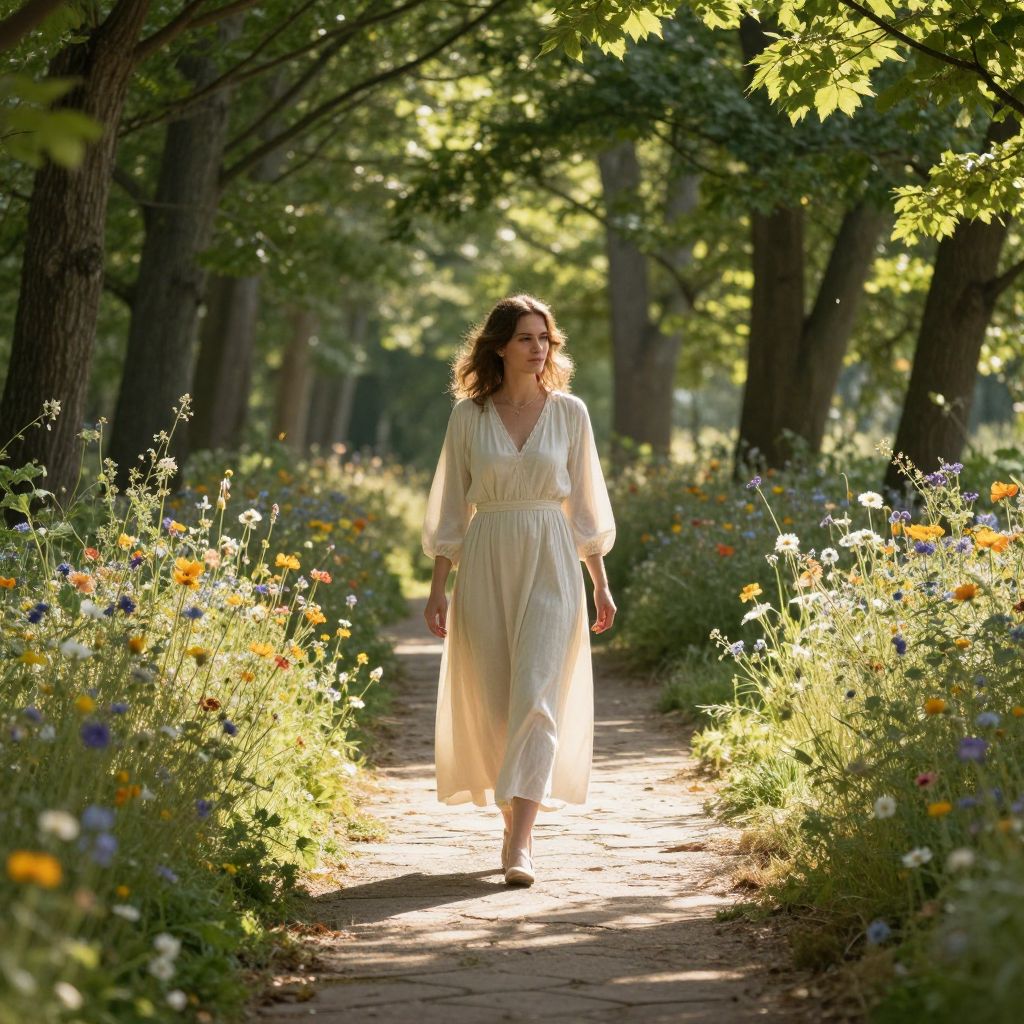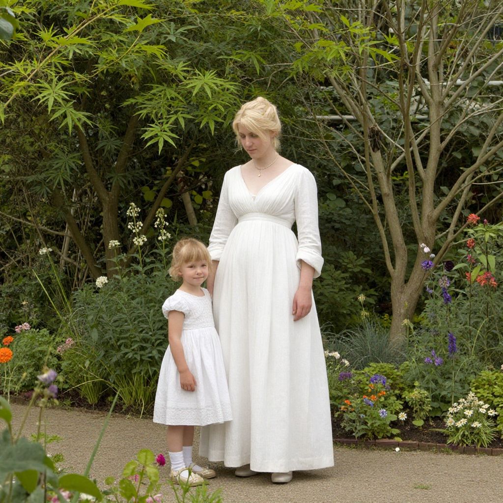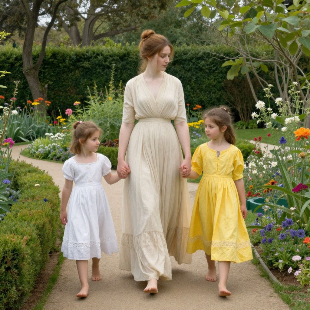 Sorolla's serene garden scene depicts a woman in a flowing cream dress with her two daughters, one in a white sundress and the other in a vibrant yellow dress, walking barefoot along a winding path surrounded by lush greenery and colorful flowerbeds.
