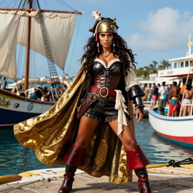 A fearless pirate queen in full adventure attire poses in a sunlit Caribbean port, wearing a corseted pirate outfit with a daringly cut leather corset, iron-studded armor at the arms, red and black boots with a steel heel, a gold-embroidered cape that flares behind her, and a golden helmet with a crown of seashells; her face is strong and determined with a wide nose, dark brown eyes, and a fierce expression; the scene is vibrant with sails, fishing boats, and a bustling crowd in the background.