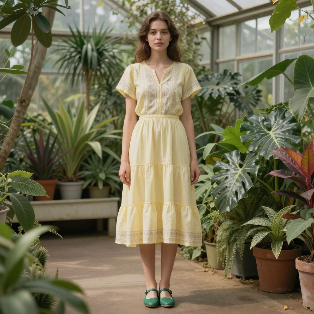 A young woman with brown hair wearing a light yellow layered dress with subtle bohemian patterns and green shoes stands gracefully in a sunlit greenhouse surrounded by lush green plants and vibrant foliage. The botanical setting features natural light illuminating the detailed leaves, creating a serene and peaceful atmosphere.