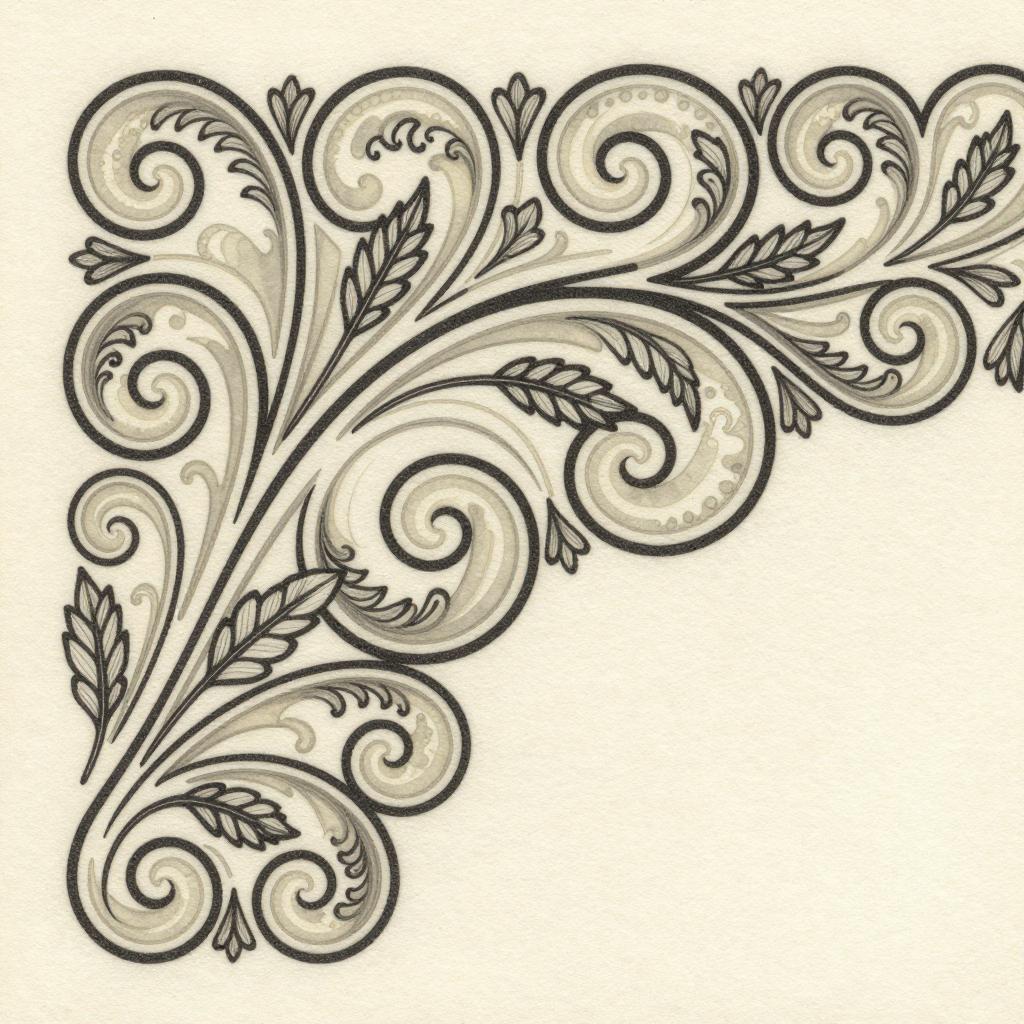 Scrollworks pattern featuring Art Nouveau flowing organic tendrils with stylized leaves in matte black scrollwork on pale ivory arranged as layered scrolls fading into the background toward the edges on ornate invitation or certificate background rendered as watercolor wash background with sharp line-art scrolls, ultra-detailed, sharp ornamental design, high resolution, intricate decorative pattern art