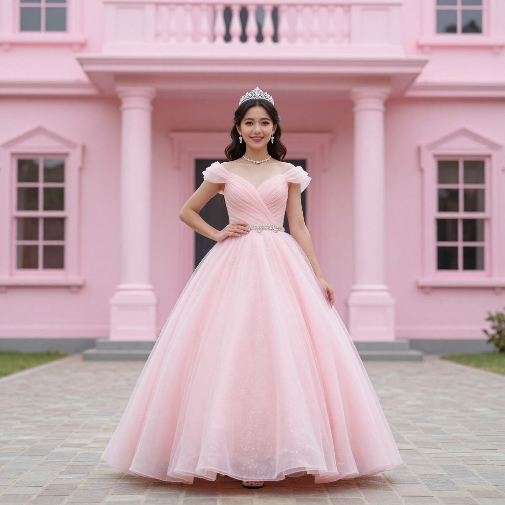 Photograph of a young woman standing in front of a pink, classical-style mansion with large windows and columns. She wears a sparkling silver tiara, a pink, short-sleeved, V-neck ball gown with a full, glittery tulle skirt, and a silver belt. Her dark hair is styled in loose curls, and she smiles slightly. She stands with one hand on her hip on a stone-paved pathway. The mansion's pink exterior and the woman's dress create a cohesive, elegant look. The image is brightly lit with a soft, even light.
