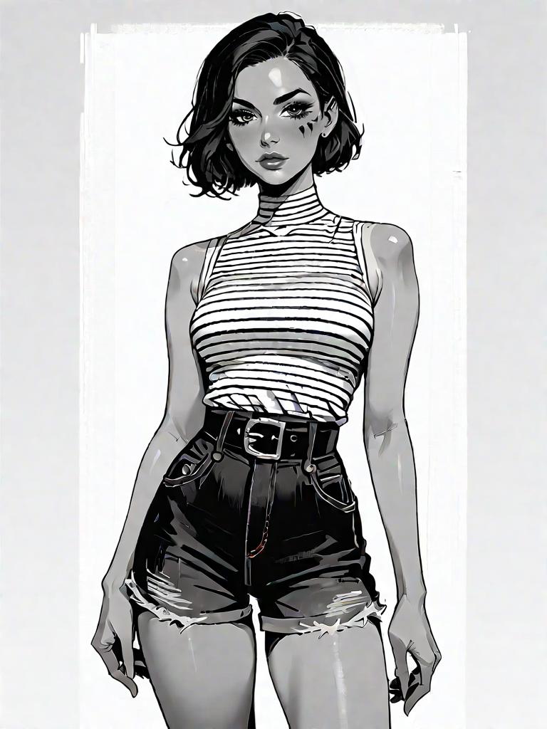 Illustration of a confident woman with olive skin and black hair with pink highlights, wearing a pastel pink cropped tank top with a cute white cartoonish graphic, paired with distressed high-waisted denim shorts. The woman is standing casually with both hands in her pockets, against a subtle background featuring stylized white foliage outlines. The artwork emphasizes a modern, edgy fashion style with vibrant colors and a relaxed pose.