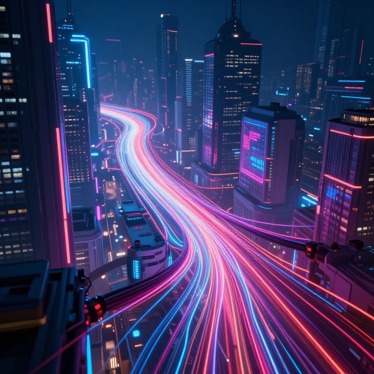Photograph of a neon-lit cityscape at night. A winding highway filled with long-exposure light trails in vibrant pink, blue, and white streaks cuts through the center. Tall skyscrapers with illuminated signs and windows in various shades of blue, purple, and pink surround the highway. The background is a deep blue night sky, adding contrast to the bright lights. Traffic lights and street signs are visible at the bottom, adding urban detail. The image has a futuristic, cyberpunk aesthetic with sharp contrasts and dynamic light patterns.
