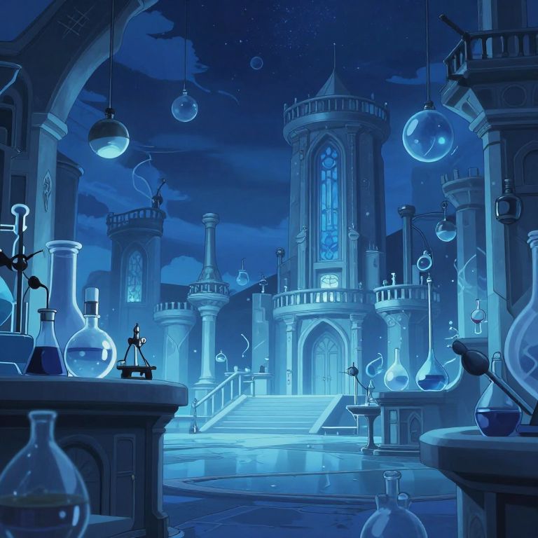 Photoshoot Shaded amazing anime scenery wallpaper, blue medieval laboratory, blue palette, stylized,