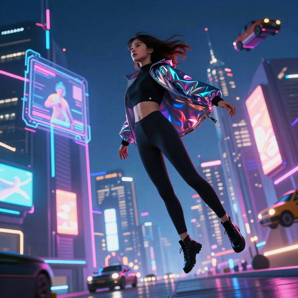 A vibrant, digital CGI image of a young woman with long black hair, jumping mid-air in a neon-lit, futuristic cityscape. She wears a shiny, metallic jacket over a black crop top and high-waisted black pants, paired with black ankle boots. The background features tall skyscrapers adorned with bright, colorful neon signs in blues, pinks, and purples. A flying yellow taxi is visible in the night sky, and several cars are on the wet, reflective street below. The woman's expression is determined, and her jacket reflects the surrounding neon lights, adding a dynamic, energetic feel to the scene.