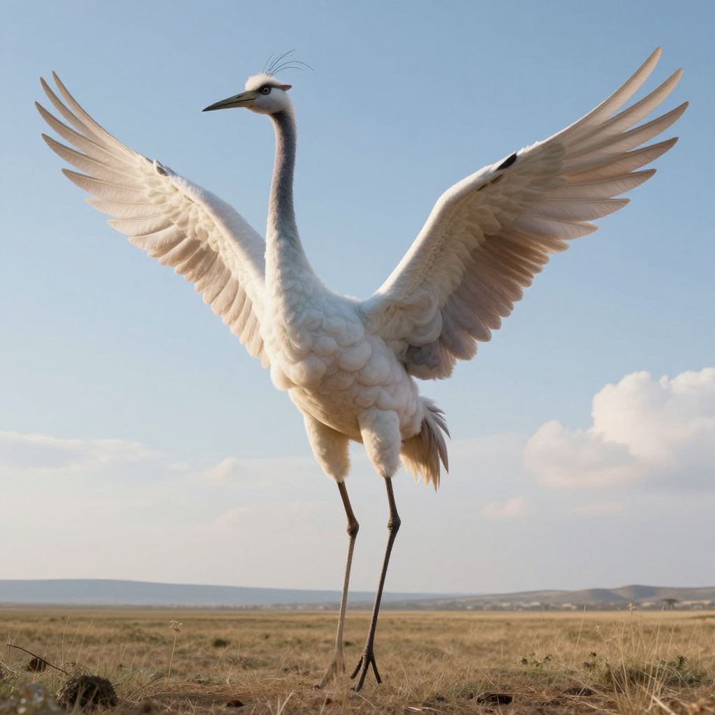 Photograph of a majestic white crane with outstretched wings, standing on a grassy plain under a clear blue sky. The crane's feathers are delicately textured, with sunlight highlighting its wings. Its long, slender black legs and sharp beak contrast against the white plumage. In the background, the horizon features distant, low-lying hills and a few scattered clouds. The grass is dry and brown, suggesting a late summer or autumn setting. The crane's posture is elegant, with wings fully open, creating a sense of grace and freedom.