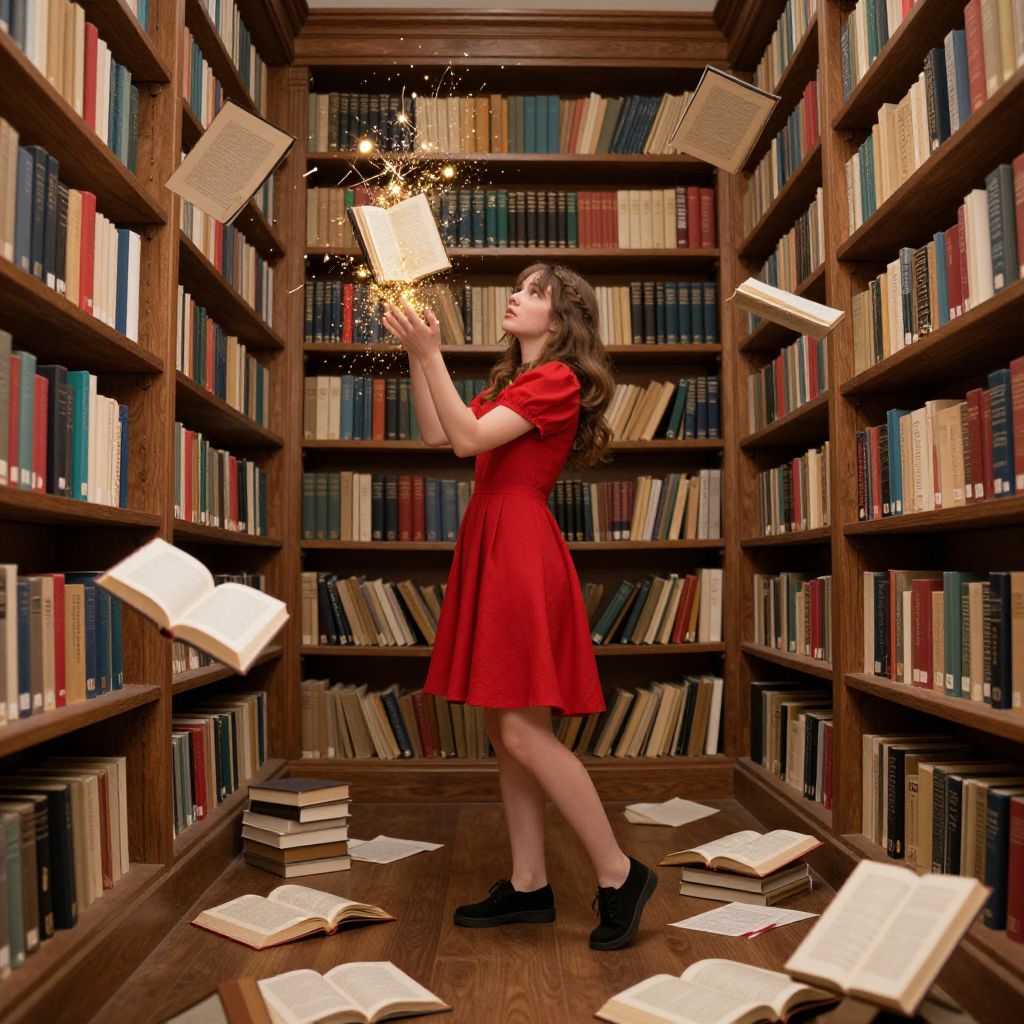 Books float and burst with golden sparks above a young woman in a red dress, who stands amidst a library filled with wooden shelves brimming with colorful volumes, as scattered pages and open books rest on the floor around her.