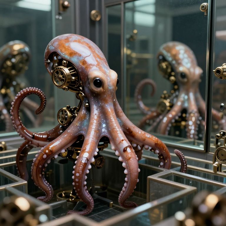 An ancient, mechanical octopus with clockwork limbs and a face of soft emotion navigates labyrinths of mirrors looking for its own reflection.