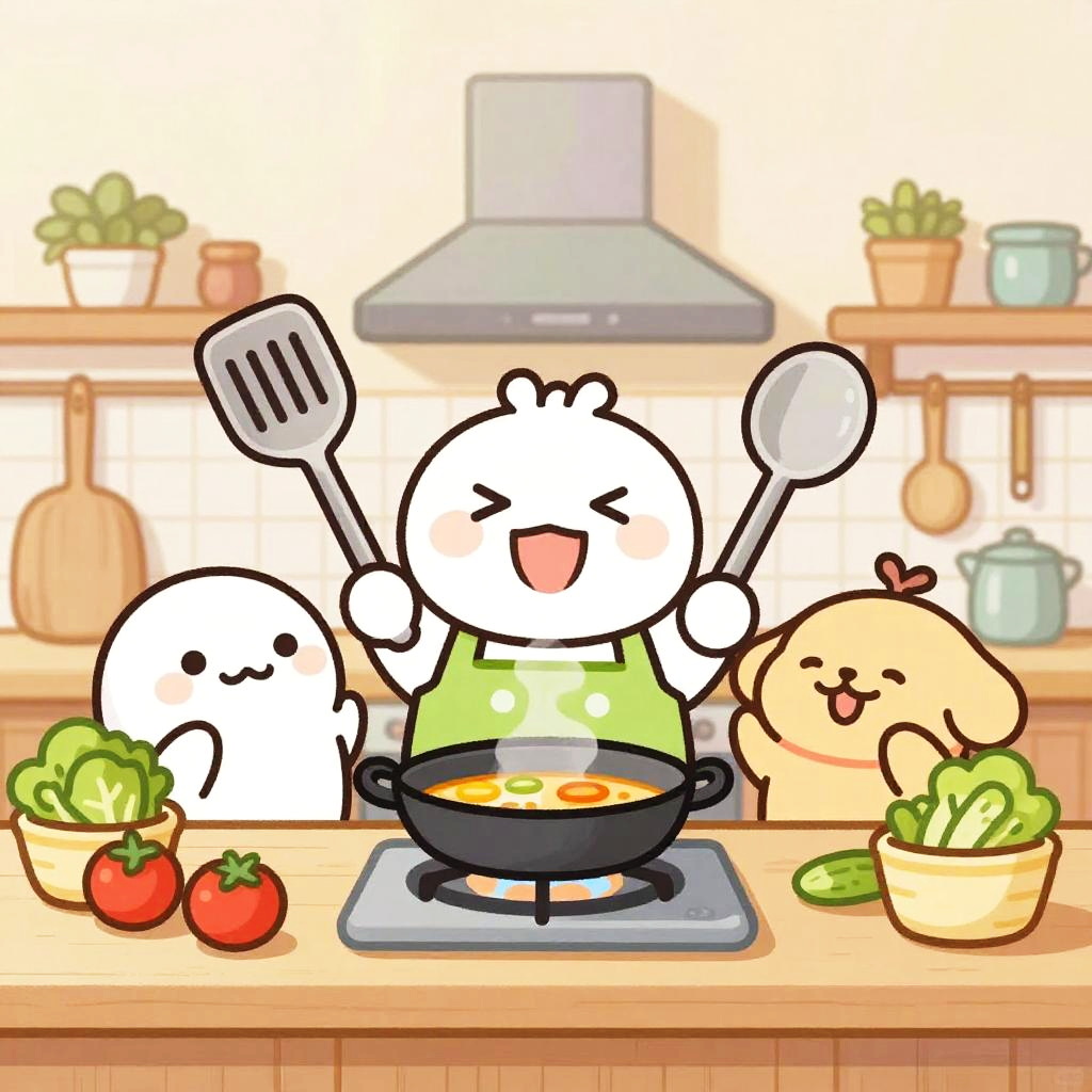 Cartoon filter effect used on a cheerful kitchen scene, warm tones and clean lines, animated characters cooking with oversized utensils, playful expressions, bright and cozy room filled with colorful ingredients and homey textures
