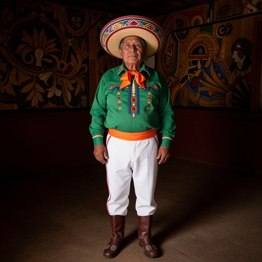 Photograph of an elderly Indigenous Mexican man in vibrant green shirt, white pants, orange belt, brown boots, and colorful sombrero, standing in dim