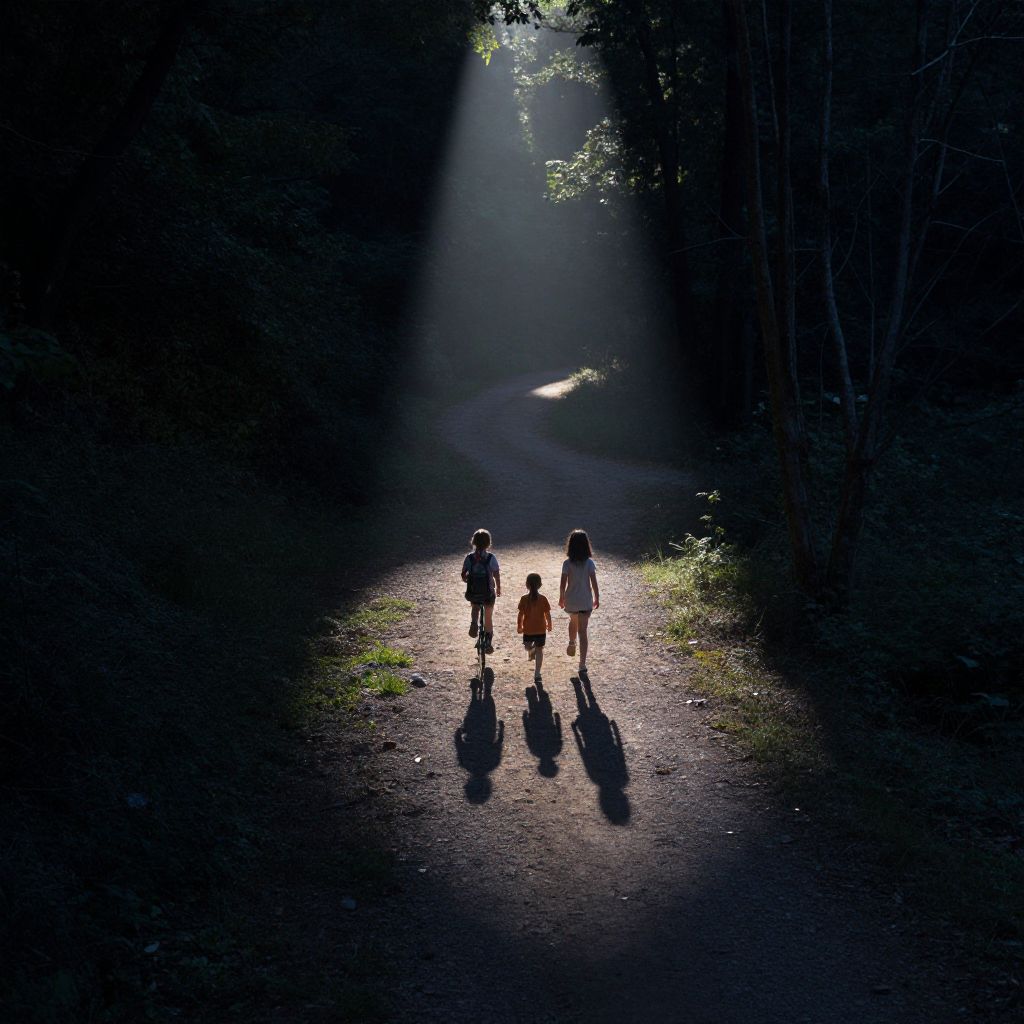 Silhouetted photograph of three children walking down a sunlit forest path, their long shadows stretching ahead, surrounded by dark trees.