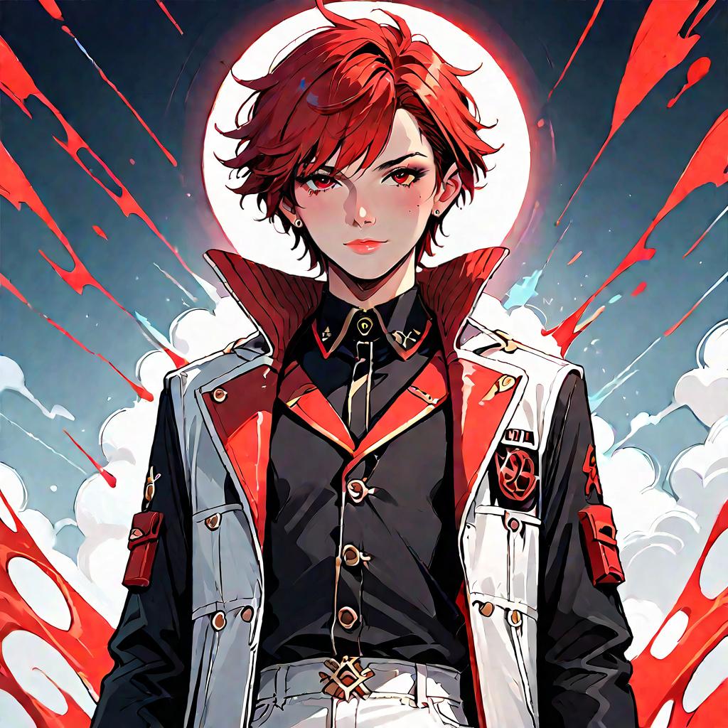 1boy, solo, multicolored jacket, black sleeves, red hair, red eyes, white jacket, white pants, red vest, score_9, score_8_up, score_7_up, source_anime