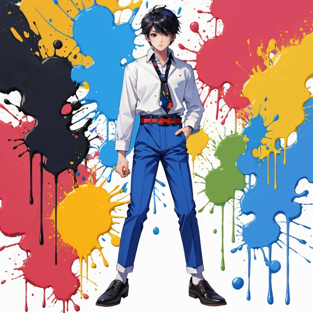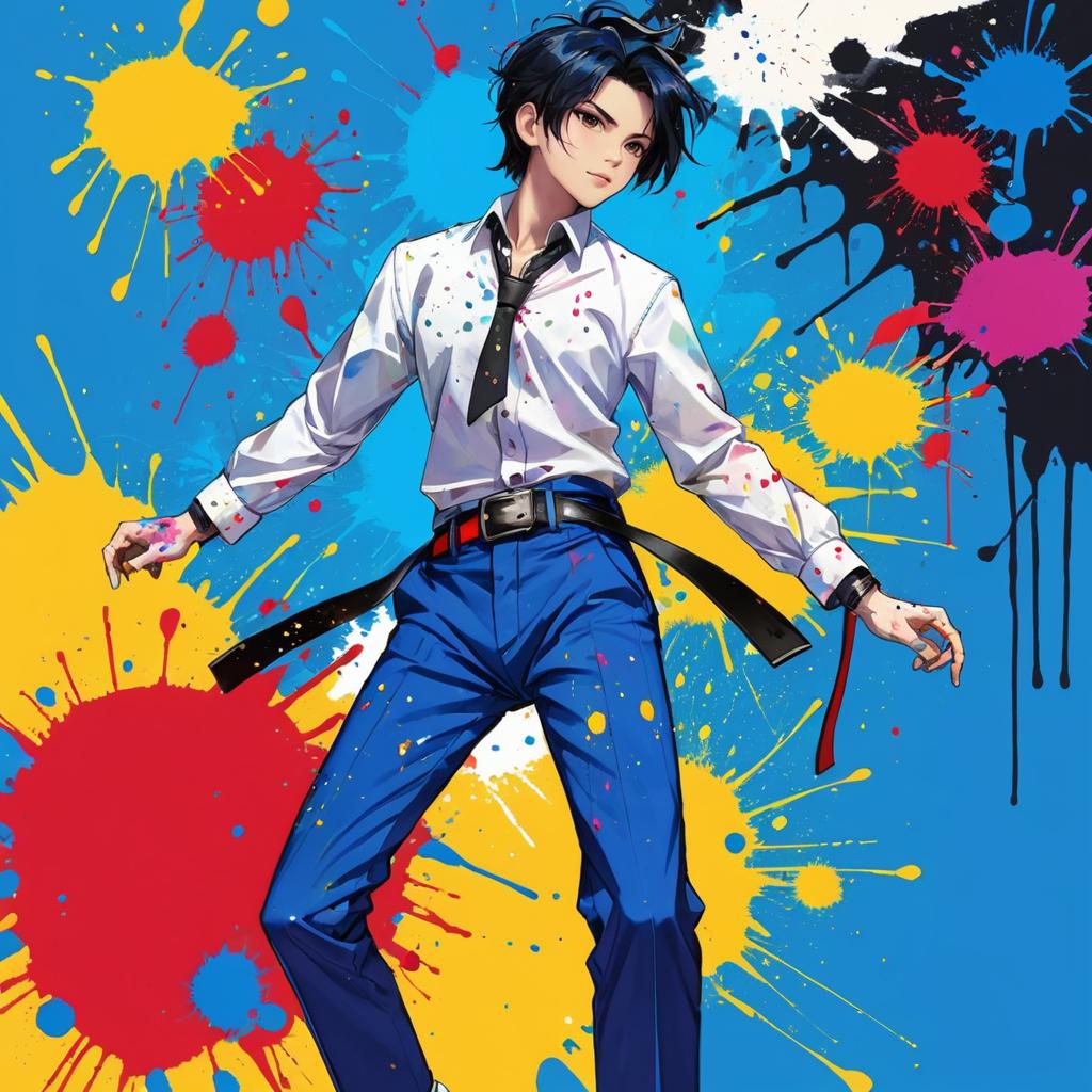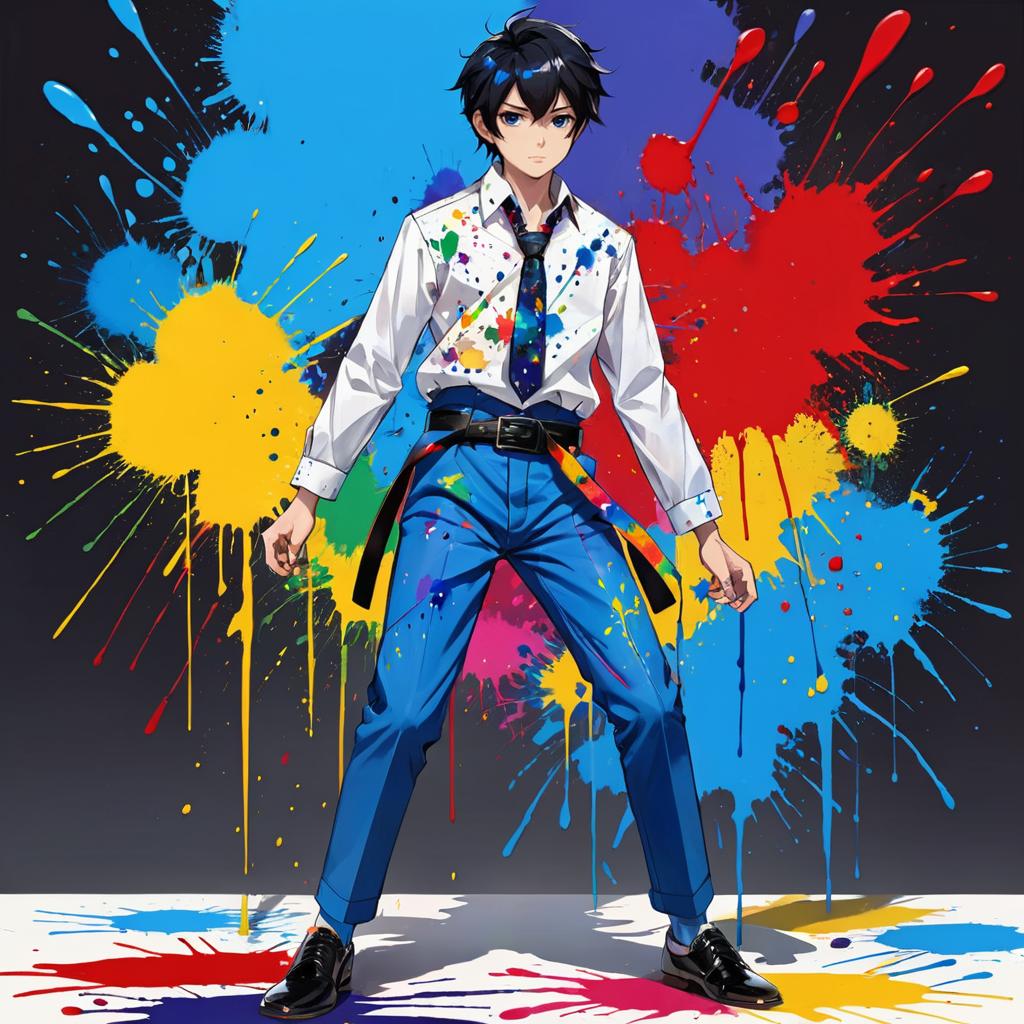 1boy, male focus, solo, pants, shirt, blue skin, colorful, white shirt, belt, jacket, colored skin, collared shirt, blue pants, feet out of frame, traditional media, long sleeves, standing, multicolored background, black hair, dress shirt, suit, black belt, open clothes, paint splatter, painting (medium)
