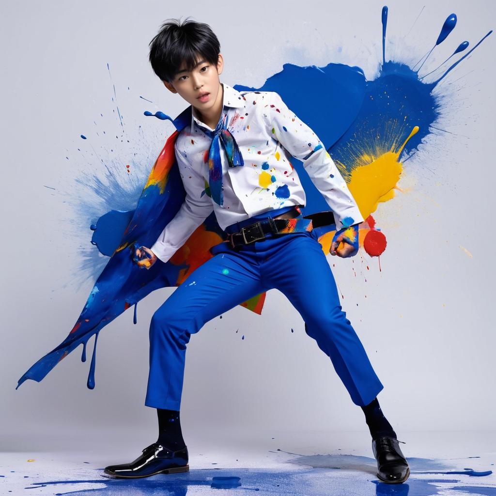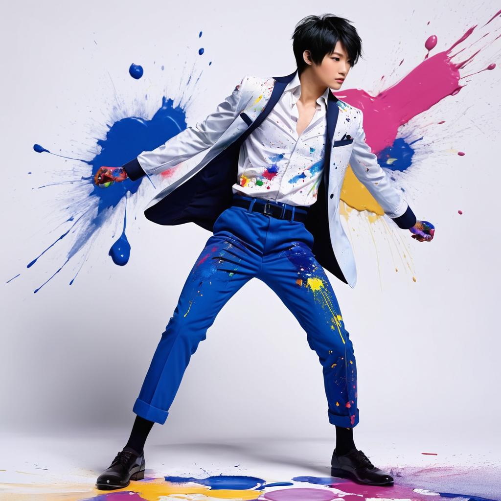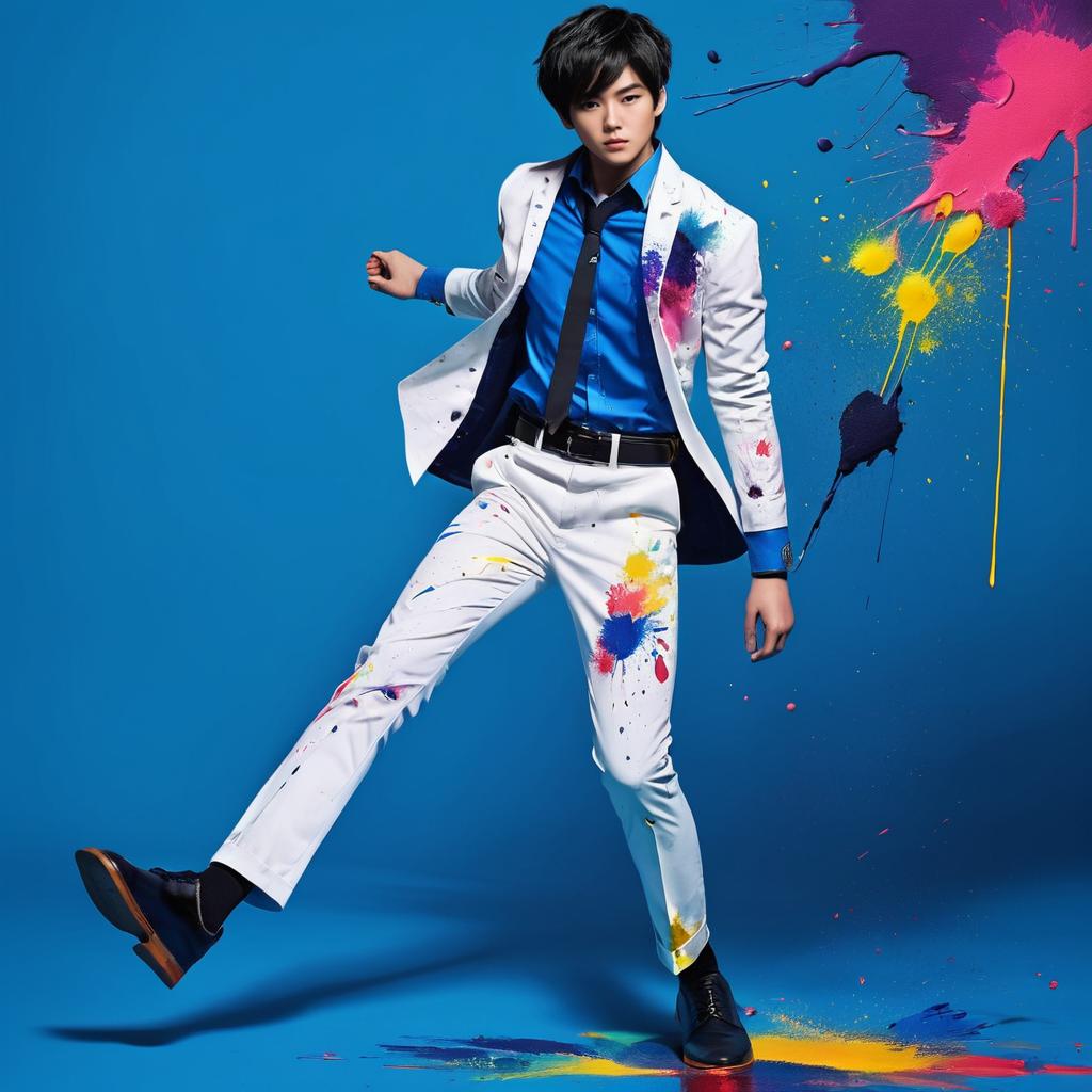 A young man dressed in a stylish blue suit, white shirt, and blue tie stands with arms outstretched against a white background covered with vibrant multi-colored paint splashes. The paint splatters include shades of blue, yellow, red, and black, creating an artistic and dynamic backdrop.