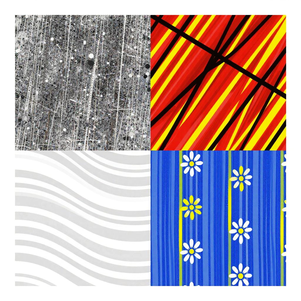 This image is a digital collage featuring four distinct, colorful sections. The top left section has a textured, gray, and white pattern resembling rain or splatters. The top right section is a vivid, chaotic mix of red, yellow, and black diagonal lines. The bottom left section shows a white, wavy, and striped pattern. The bottom right section displays vertical blue stripes with white and yellow floral designs. The overall style is abstract and vibrant.