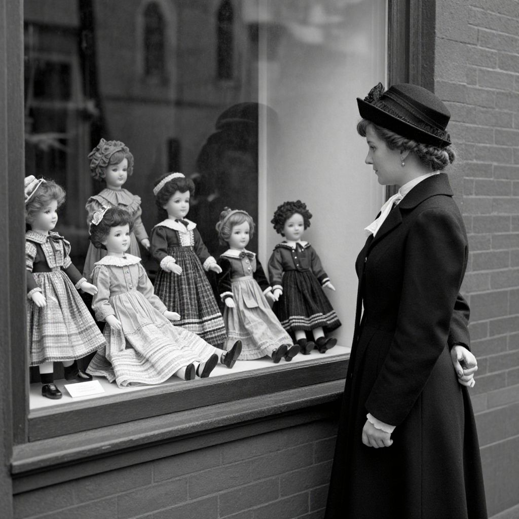 The image depicts a vintage scene with a woman standing in front of a window display of dolls. The dolls are dressed in period-appropriate attire, with some wearing dresses and others in more formal outfits. The woman, dressed in a long coat and hat, appears to be admiring the dolls. The dolls are arranged in a row, with some standing upright and others lying down, creating a sense of depth and perspective. The window display is set against a brick wall, and the scene is captured in black and white, giving it a timeless quality. The overall composition is balanced, with the woman and the dolls creating a focal point in the image. The dolls' intricate details and the woman's attire suggest a historical context, possibly from the early 20th century. The image evokes a sense of nostalgia and curiosity, inviting the viewer to imagine the stories behind these dolls and the woman who admires them.
