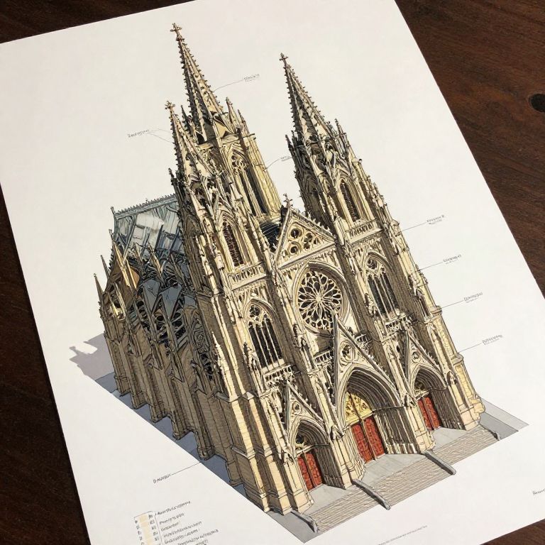 A detailed, digital architectural drawing of a Gothic-style cathedral, featuring two tall, intricately designed spires with numerous pointed arches and ornate carvings. The cathedral's facade includes large, arched windows with decorative tracery, and red double doors at the base. The drawing is rendered in a 3D style with realistic shading, placed on a white sheet of paper against a dark wooden surface. The image highlights the cathedral's elaborate, symmetrical design and detailed craftsmanship.