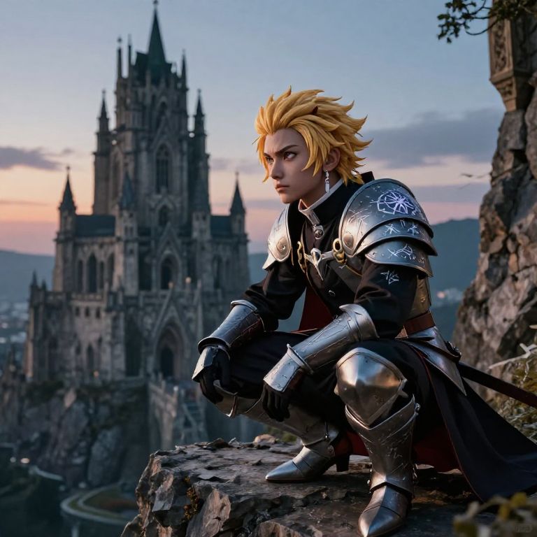 Blonde demon slayer crouched on a rocky cliff edge at twilight, sharp eyes scanning the valley below, towering gothic castle in the background, intricate armor with magical runes, intense and heroic atmosphere.