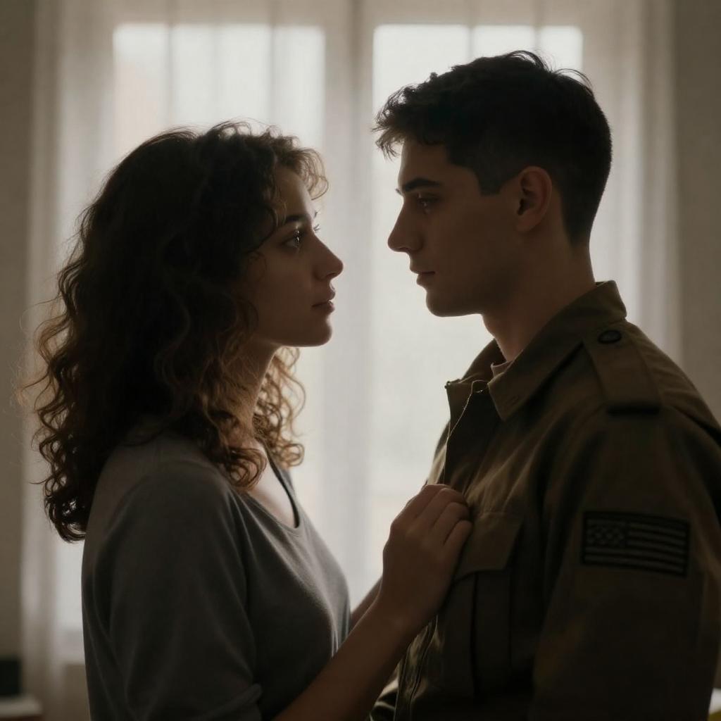 Photograph of a young man and woman in a dimly lit room, facing each other closely. The man, with short dark hair and wearing a military-style uniform, gazes intently at the woman, who has curly brown hair and wears a gray top. Light filters through a sheer curtain behind them, creating a soft glow. The woman's hand rests on the man's chest.