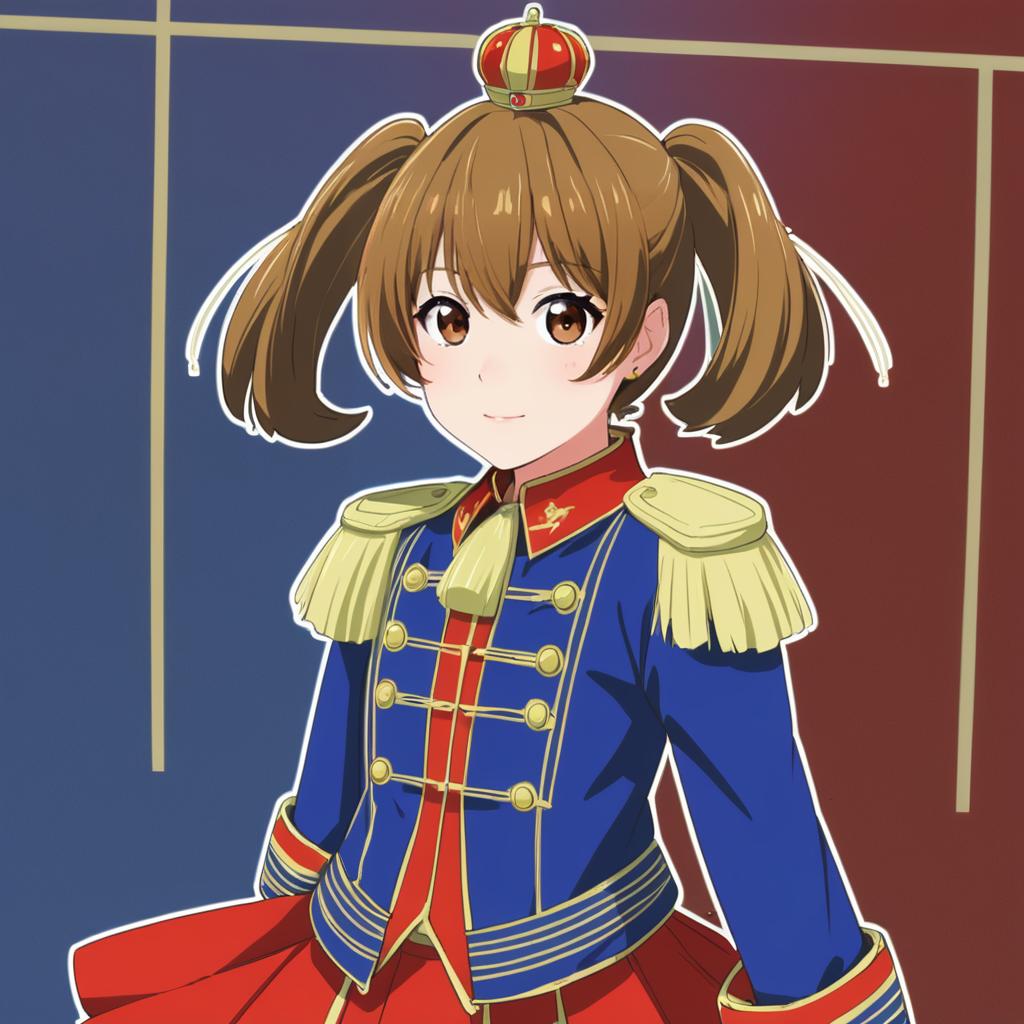 Illustration of an anime girl with brown eyes and brown hair styled in two side ponytails. She wears a detailed multicolored military-style jacket featuring blue, red, and gold accents, including epaulettes and gold buttons. The outfit is completed with a red pleated miniskirt and a small crown-like headpiece. The girl has a gentle expression with swept bangs and a slightly tilted headwear, inspired by the character Aijou Karen from shoujo kageki revue starlight.