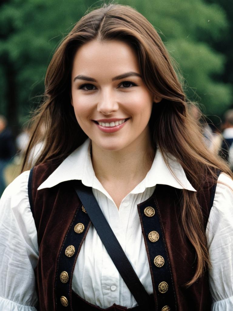 Portrait of a young woman with long brown hair wearing a white shirt and dark vest, dressed in Renaissance-style costume. She is smiling and looking directly at the camera with a blurred outdoor background featuring greenery and a building in the distance.