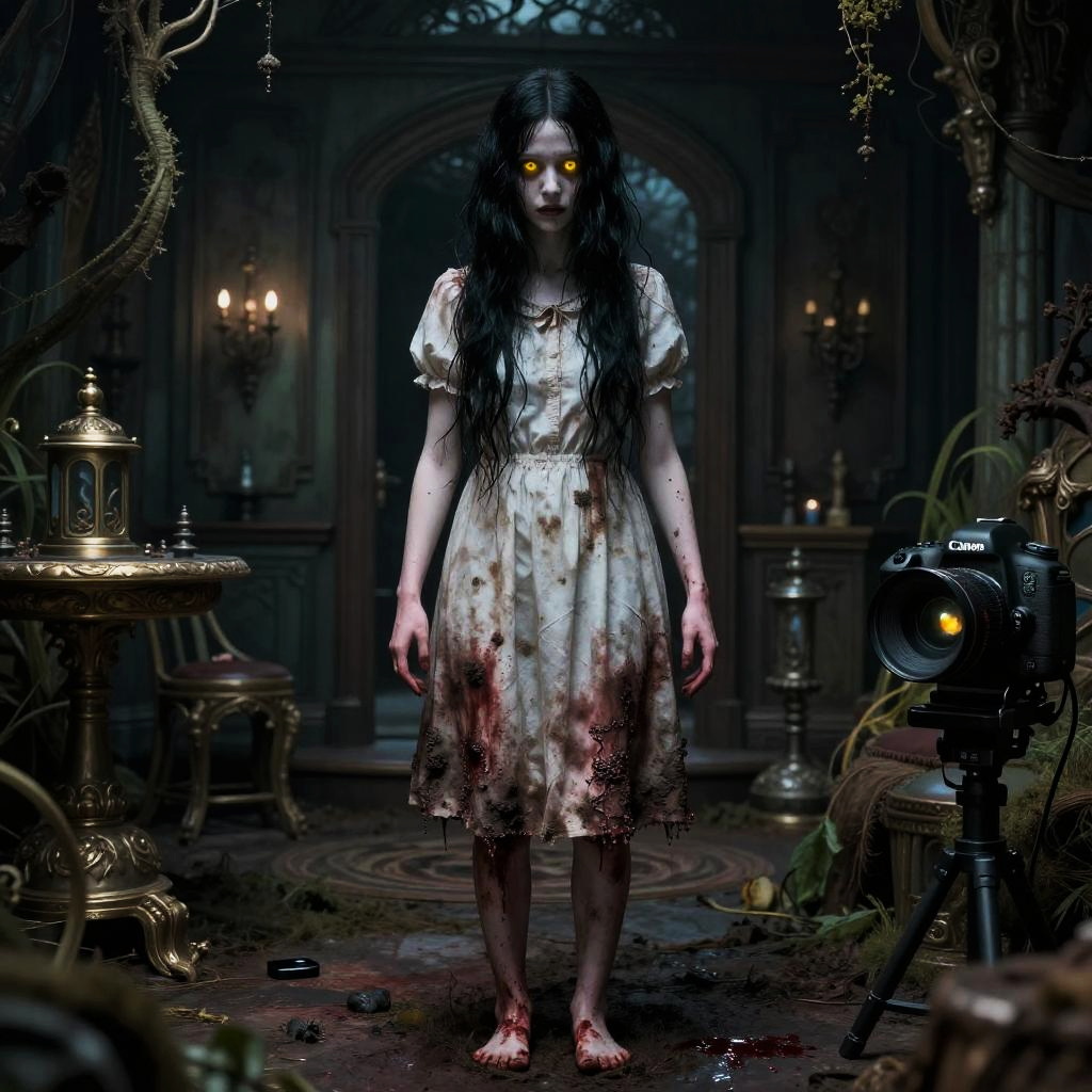 Digital artwork depicting a eerie, gothic scene. A pale, young woman with long, wet black hair stands in the center, wearing a tattered white dress stained with blood. Her glowing yellow eyes contrast starkly with the dark, shadowy background. She stands barefoot on a dirt floor, surrounded by dimly lit, ornate furniture, including a brass table lamp on the left and a vintage camera on the right. The background features arched windows and candelabras, with tendrils of vines creeping in from the sides. The overall atmosphere is dark and foreboding, with a horror-fantasy aesthetic.