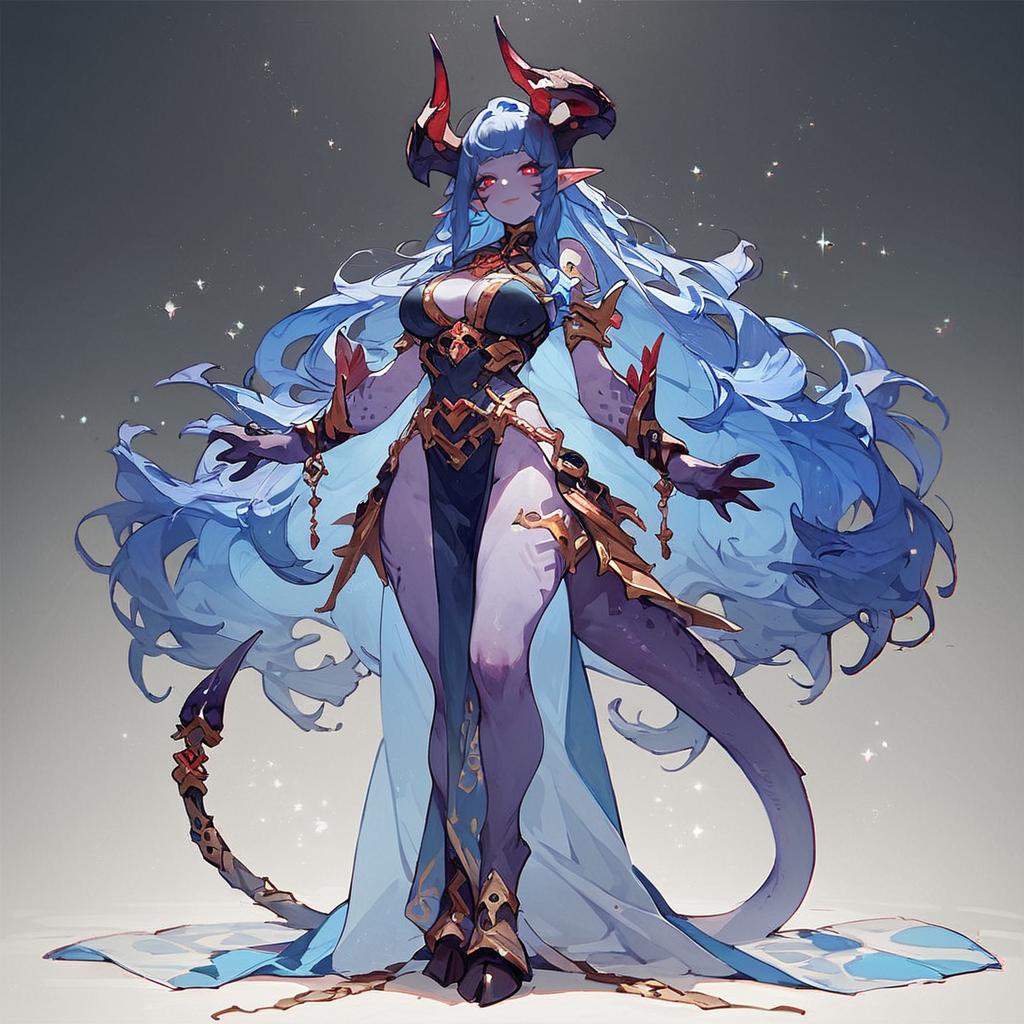 Score_9, score_8_up, score_7_up, source_anime 1girl, solo, standing, horns, pointy ears, colored sclera, purple skin, blue hair, pelvic curtain, hooves, tail, tail ornament