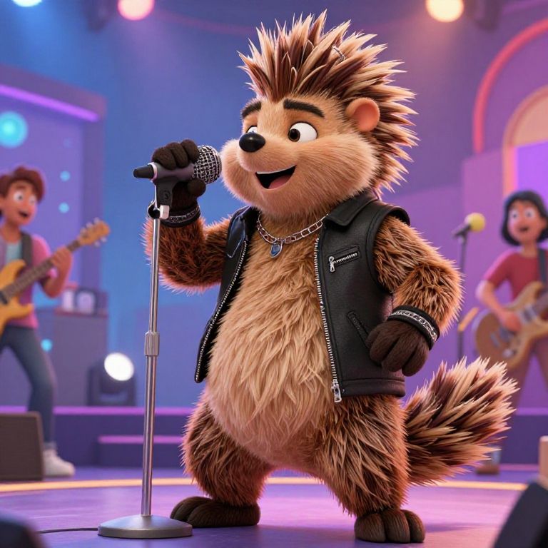 A vibrant CGI image of an anthropomorphic hedgehog with brown and beige fur, wearing a black leather vest, black gloves, and a silver necklace, singing into a microphone on stage. The hedgehog has spiky hair and a cheerful expression. In the background, two human musicians, one playing a guitar and the other on bass, are blurred but visible, adding to the lively concert atmosphere. The stage is illuminated with purple and blue lights, creating a dynamic and energetic scene.