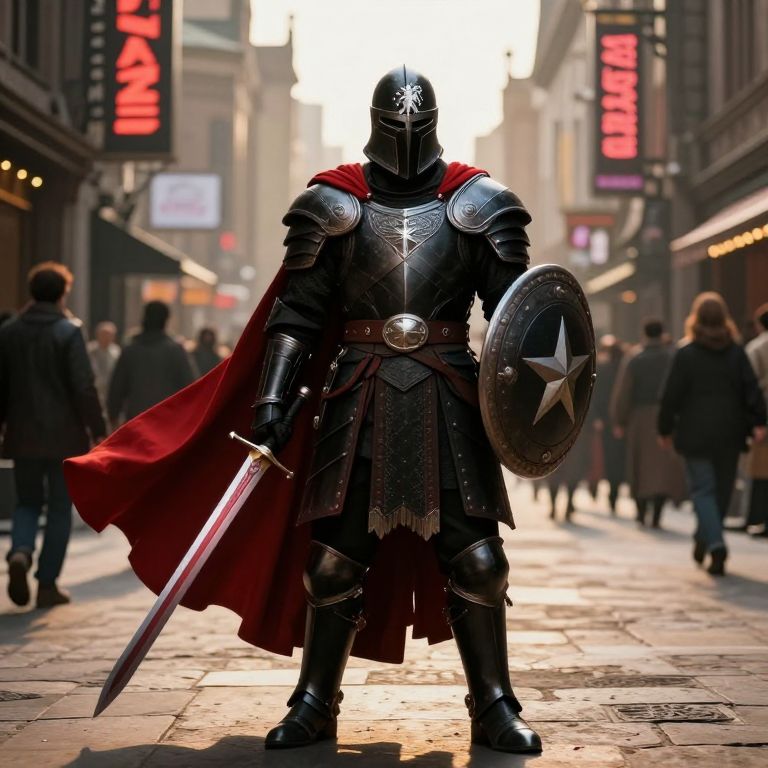 A seasoned warrior in black armor with silver accents stands firmly on a bustling city street, his imposing presence casting a shadow over the crowded pavement. He wears a full battle suit with a towering helmet adorned with a crest of a silver lion, and a flowing red cape billows in the wind, catching the golden afternoon light. The armor is well-maintained, with intricate engravings along the chest and shoulders, and a prominent belt with a polished silver buckle rests across his waist on the left side. In his right hand, he grips a long, curved sword with a dull red hilt, while in his left hand he holds a round, reinforced shield with a silver emblem of a star at its center. The street is lined with ancient stone buildings, neon signs flicker in the background, and the atmosphere is charged with tension, as if a battle is about to begin. The scene is rendered in a realistic, cinematic style with rich details and dynamic lighting.