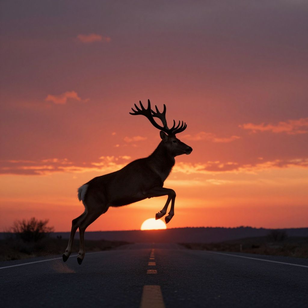 Silhouetted deer with antlers leaping on a road at sunset, vibrant orange and purple sky, sun low on horizon, road lines visible