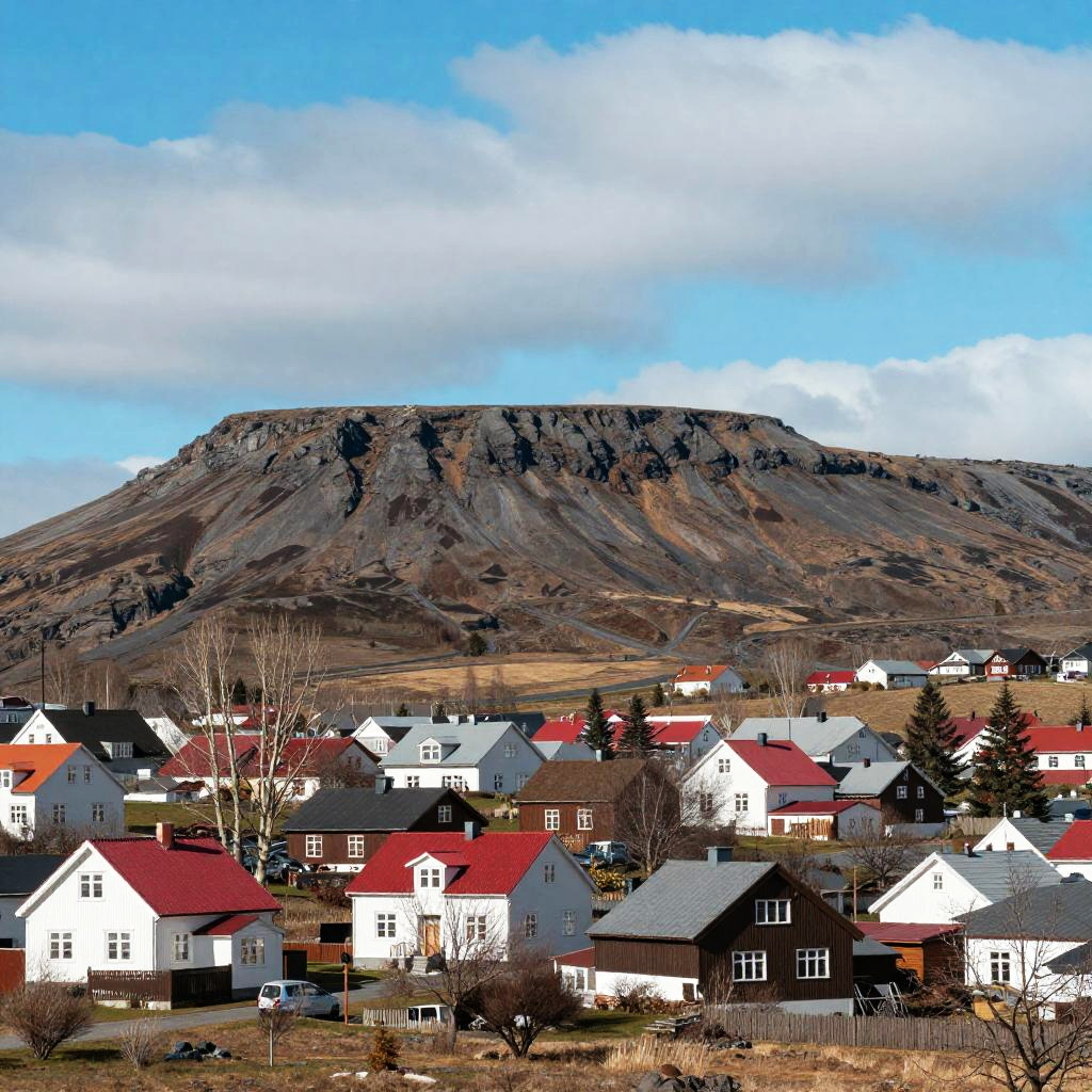 This is a colorful, slightly over-saturated photograph of a small town nestled at the base of a large, rugged mountain with a flat top. The town features white and brown houses with red roofs, surrounded by leafless trees and open fields. The sky is bright blue with fluffy white clouds. The overall composition creates a serene, picturesque rural landscape.