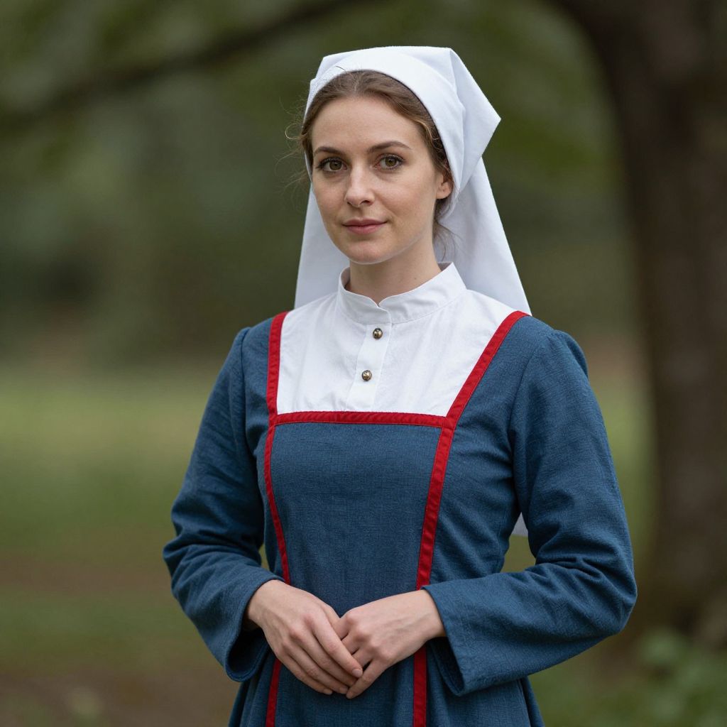 Medieval nurse costume, woman in blue dress with white hat and red trim