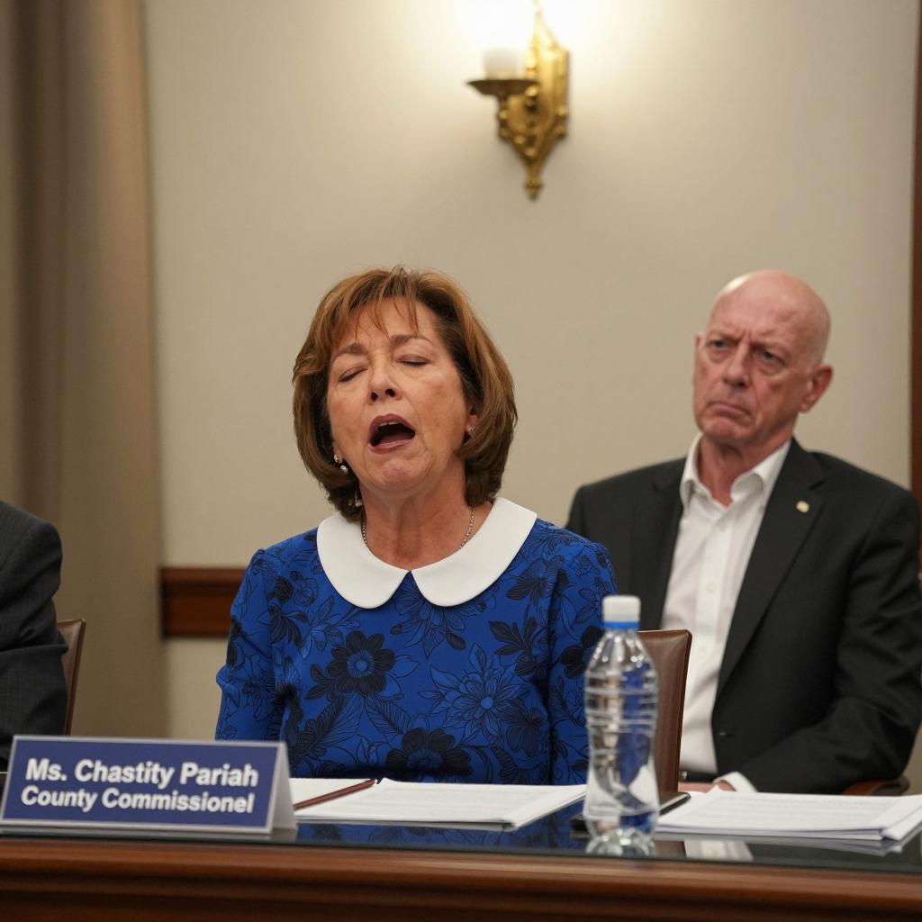 A meeting. Middle-aged woman with short brown hair, wearing a blue floral dress with a white collar, speaking passionately, eyes closed. Older man with balding head, wearing a black suit and white shirt, sits to her right, looking serious. Blue nameplate on the desk reads "Ms. Chastity Pariah, County Commissioner." Desk with glass, water bottle, and papers. Warm lighting, wall sconce in background. Curtain on the left.