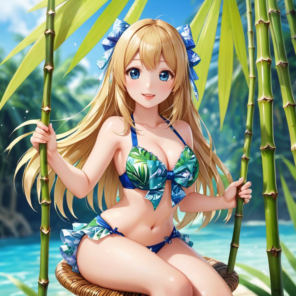 Digital artwork of a blonde anime girl in a blue frilled bikini, sitting on a wooden swing by a pool, with tropical plants in the background.
