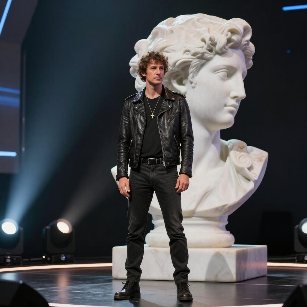 Realistic photo.a man with short curly brown hair, wearing a leather jacket, standing on stage with lights and a stage setup behind him. Styled in surrealism, with a full-length view and a marble sculpture effect, blending futuristic themes with a classic, sculptural aesthetic. realistic photo